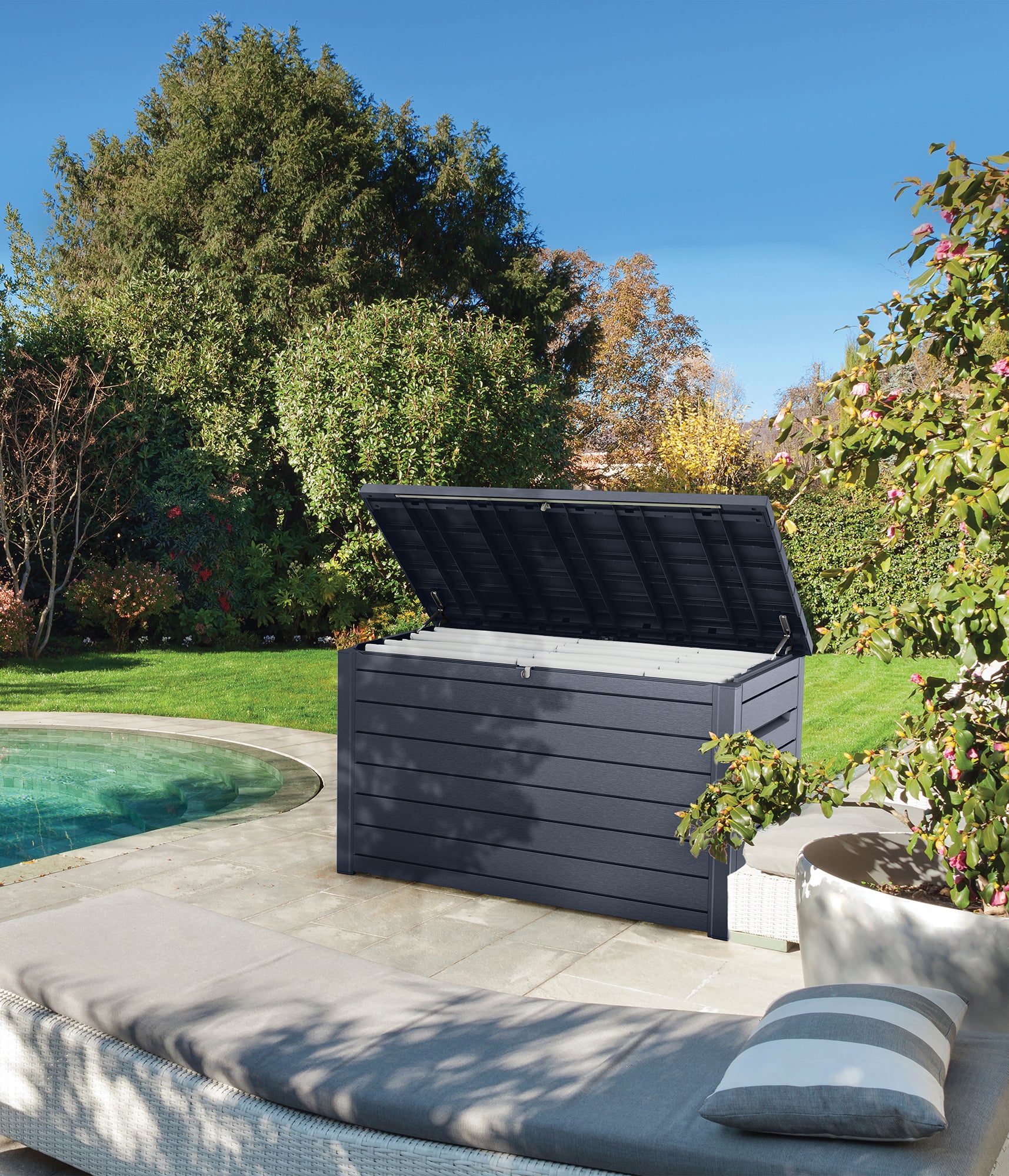 An ideal storage solution for your garden or pool area, the generously-sized Ontario box is designed to hold a wide range of items, including pool equipment, gardening tools, toys, or large cushions.