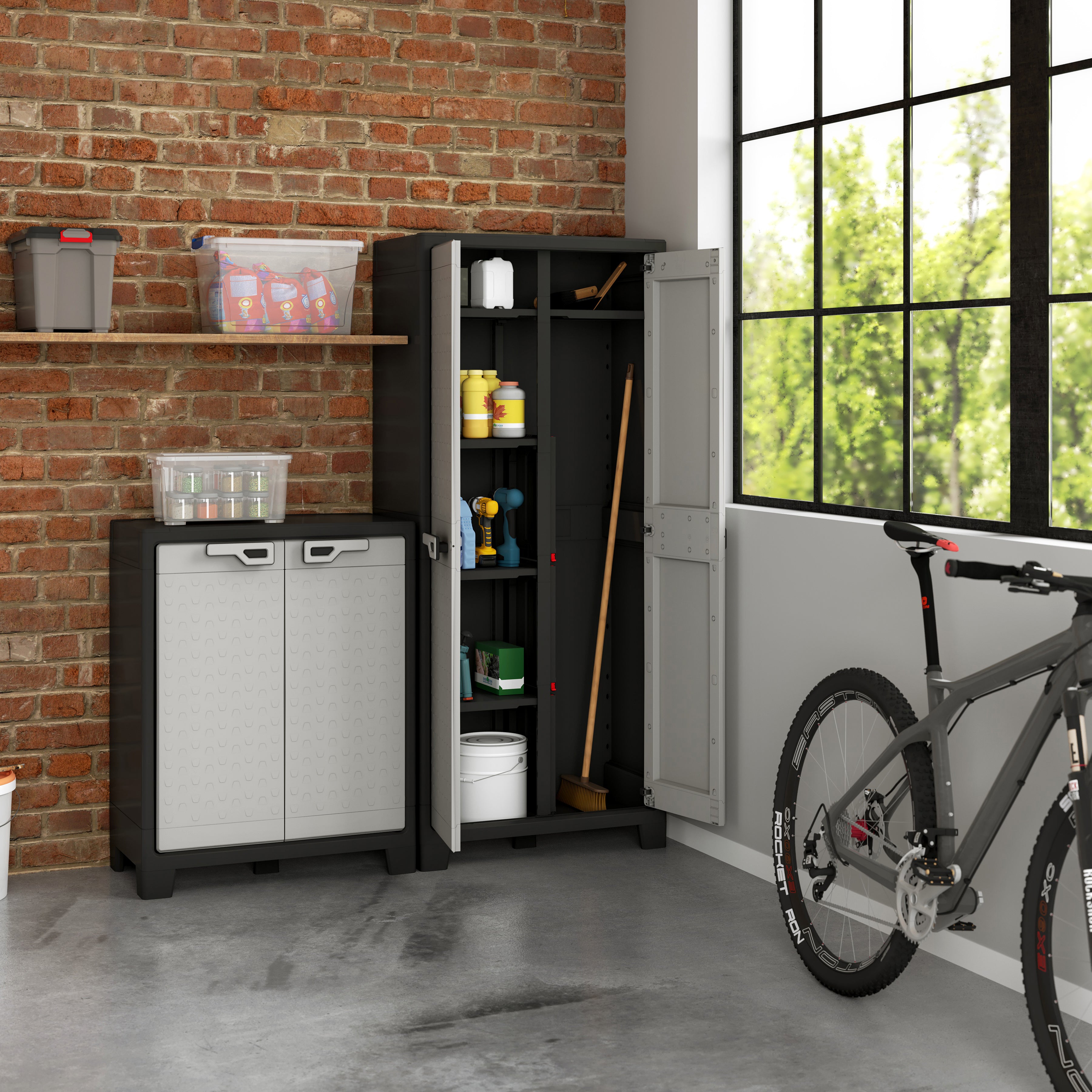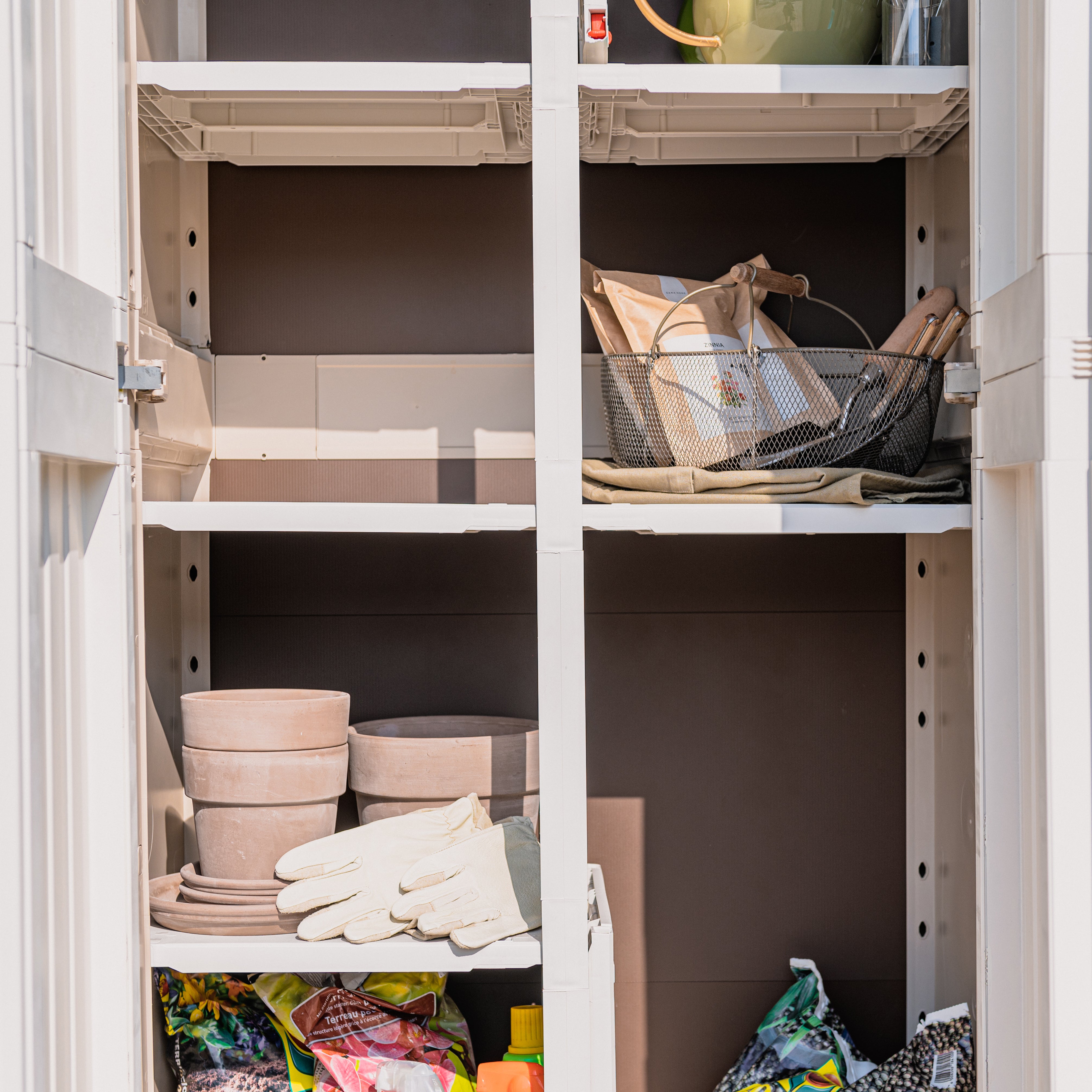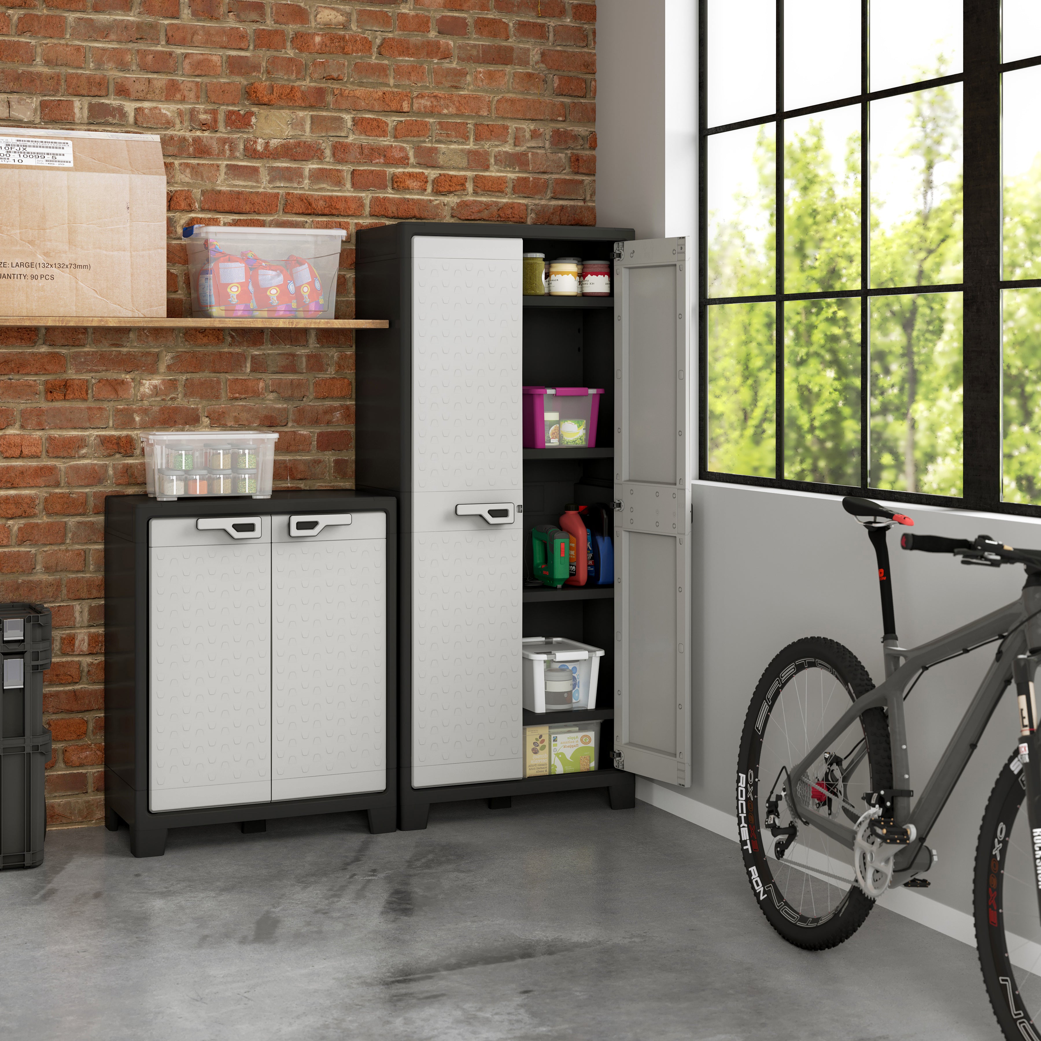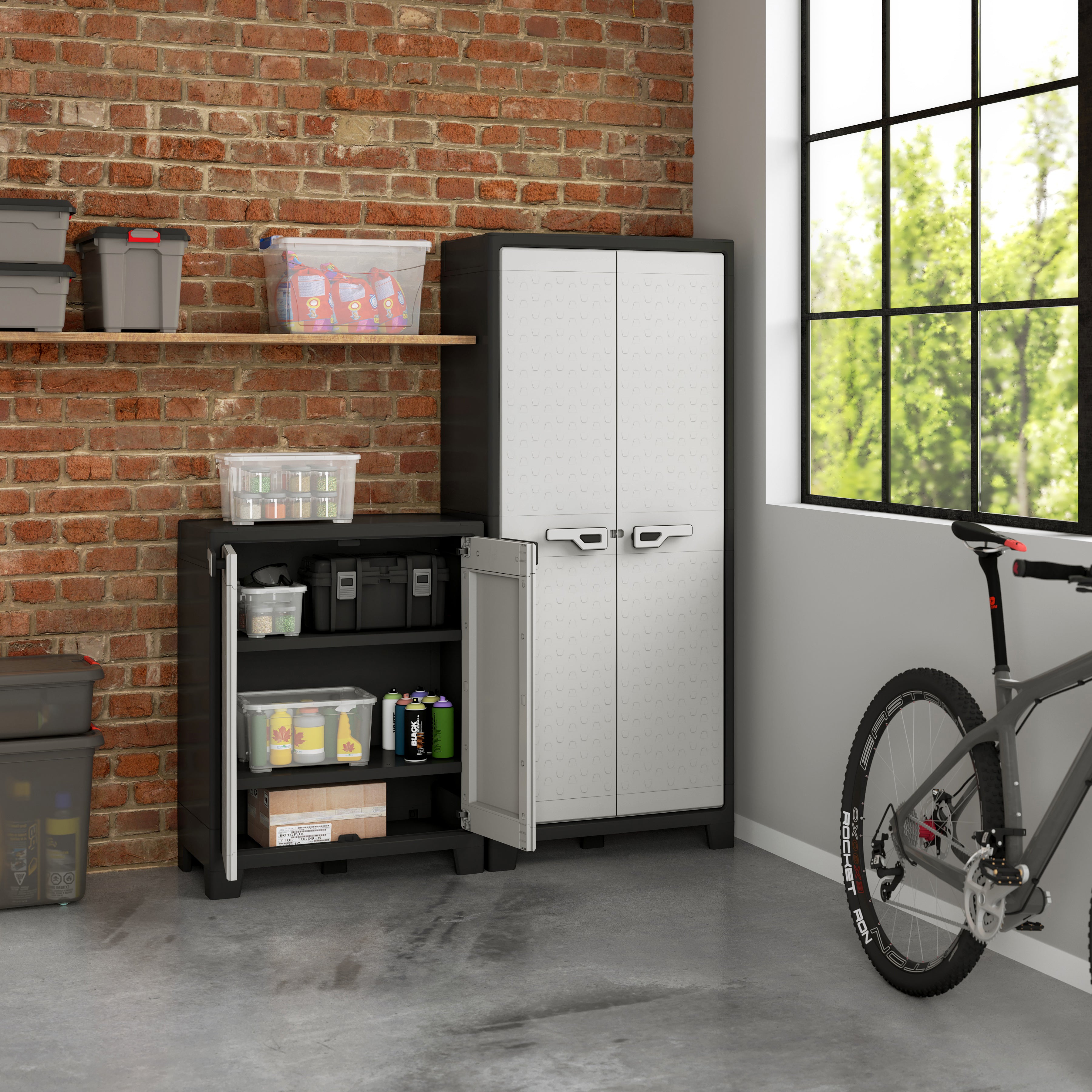 Keep your equipment organised with Keter’s range of convenient storage furniture. From short shelving to tall cabinets, you can choose a cupboard that suits your space. All of our storage units feature metal hinges and lockable doors for additional security, as well as reinforced bottoms to handle heavy weights. It’s easy to store cleaning tools, DIY equipment, sports gear, and more with our cabinets– simply adjust each cupboard shelf position to fit whatever you require.