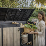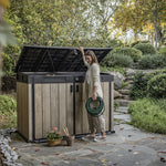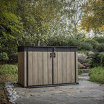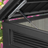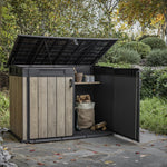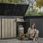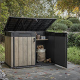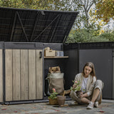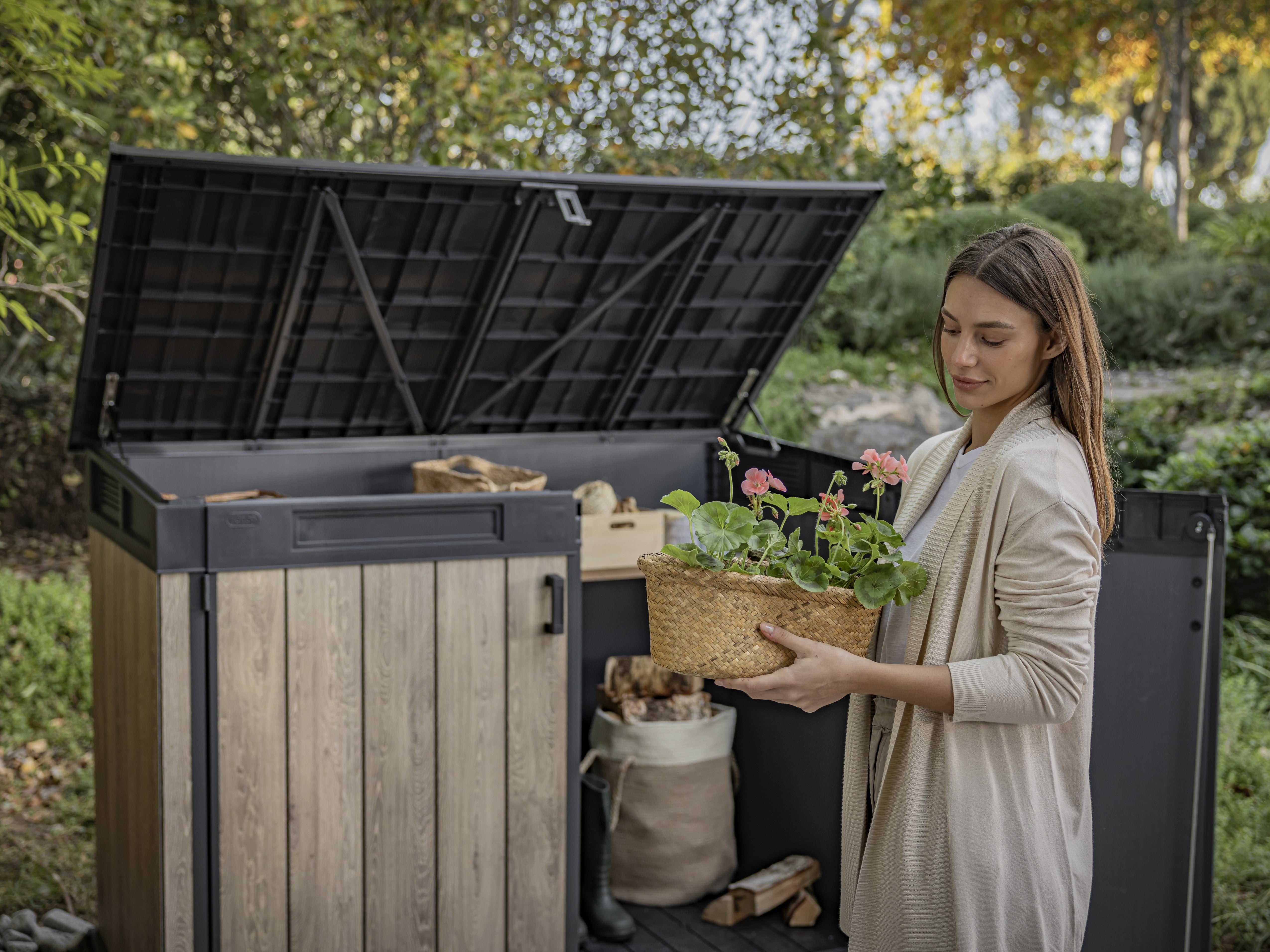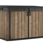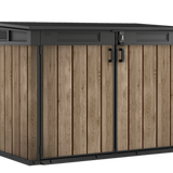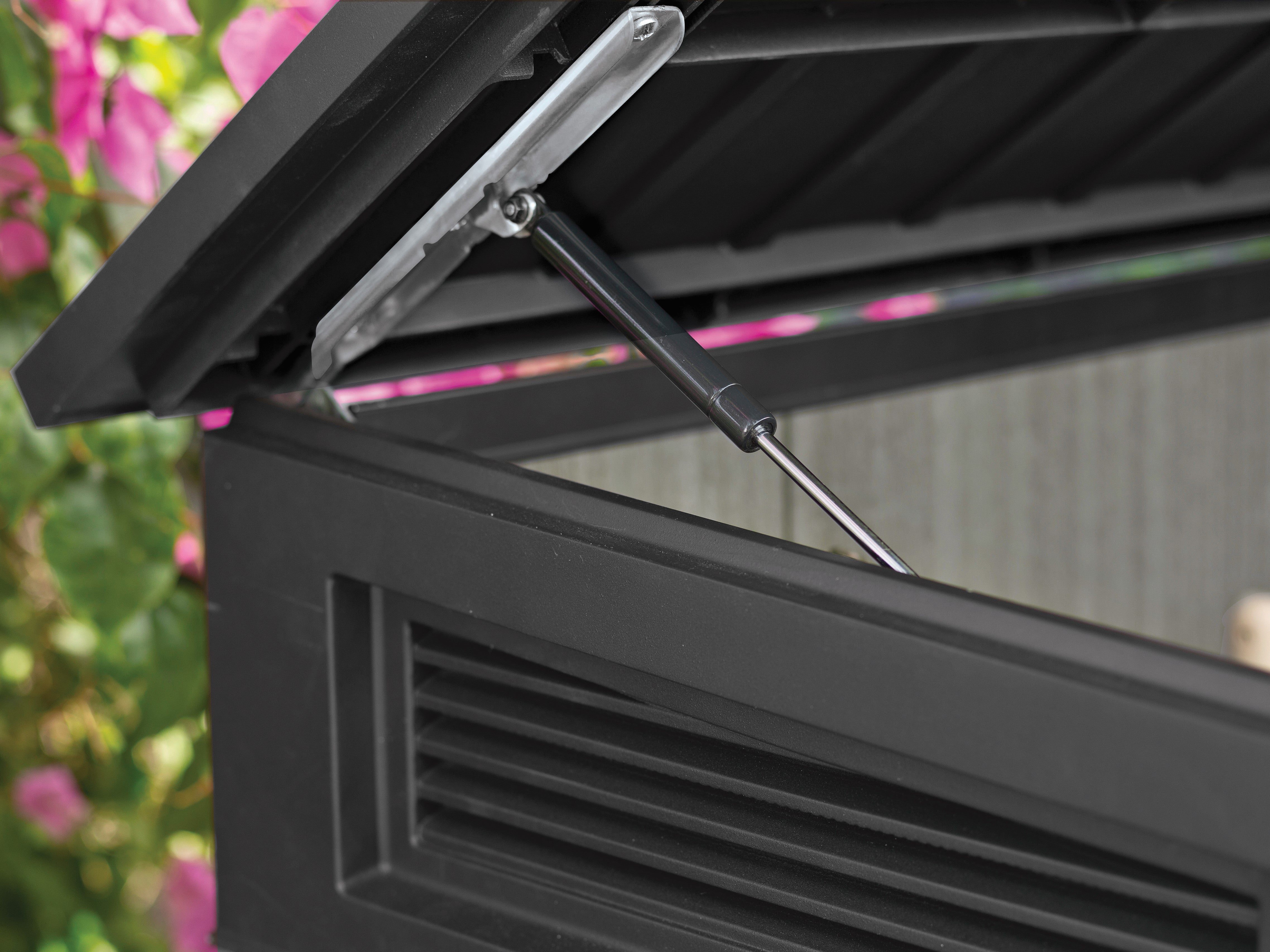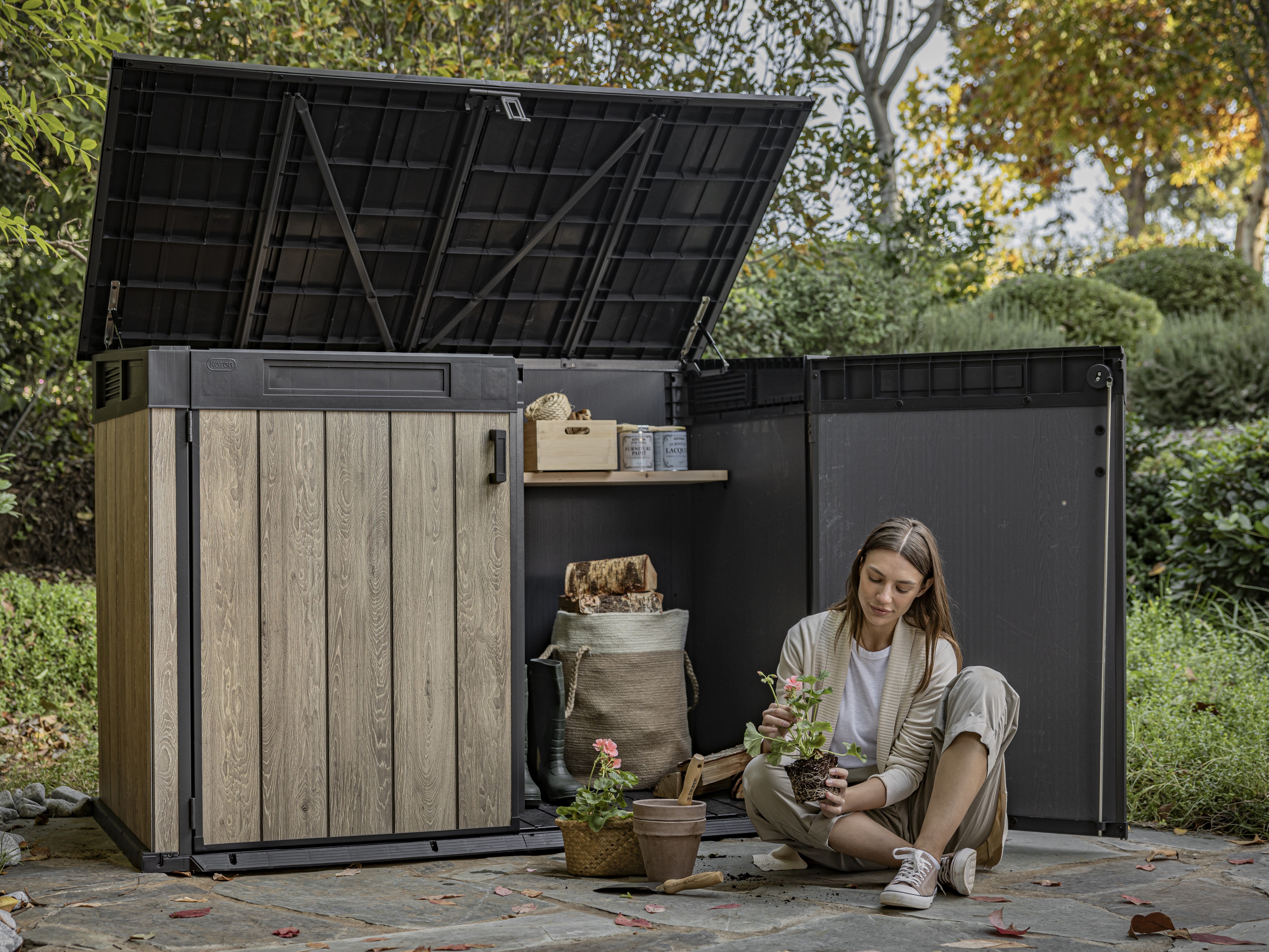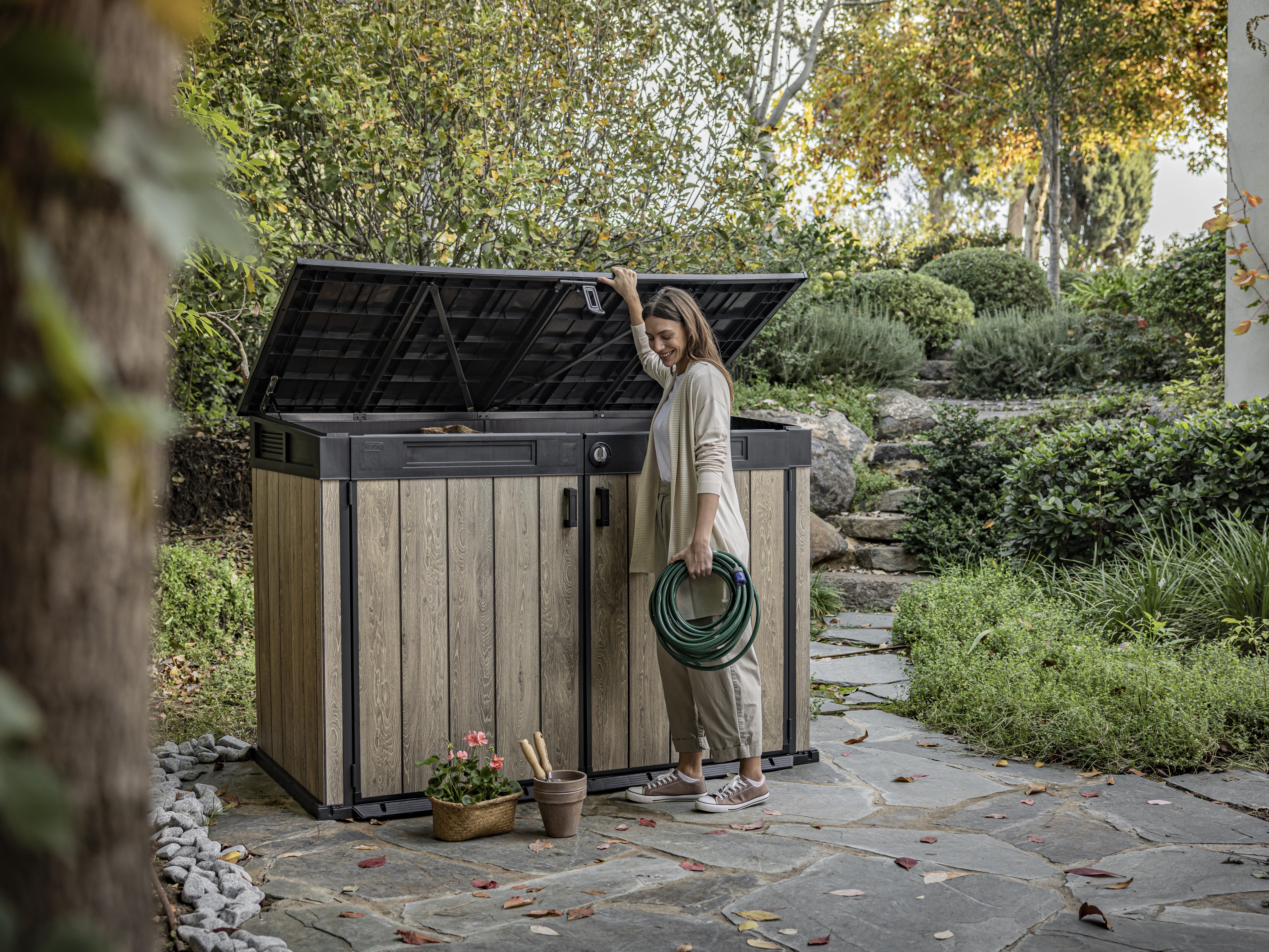 Easy to assemble, this premium horizontal storage shed features a front-opening double door and a one-handed lift top that opens with hydraulic pistons for easy access and soft closing. 2020L of storage space accommodates two 360L or three 240L rubbish bins, and the built-in ventilation keeps the unit free of nasty odours.