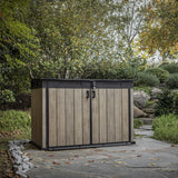 Need added security? The two front-opening doors are totally lockable. Plus, you can add wooden shelves on its adjustable brackets. The walls are made of low-maintenance, weather-resistant resin that won’t rust, fade, dent, or peel—so you know this horizontal storage shed is built to last!
