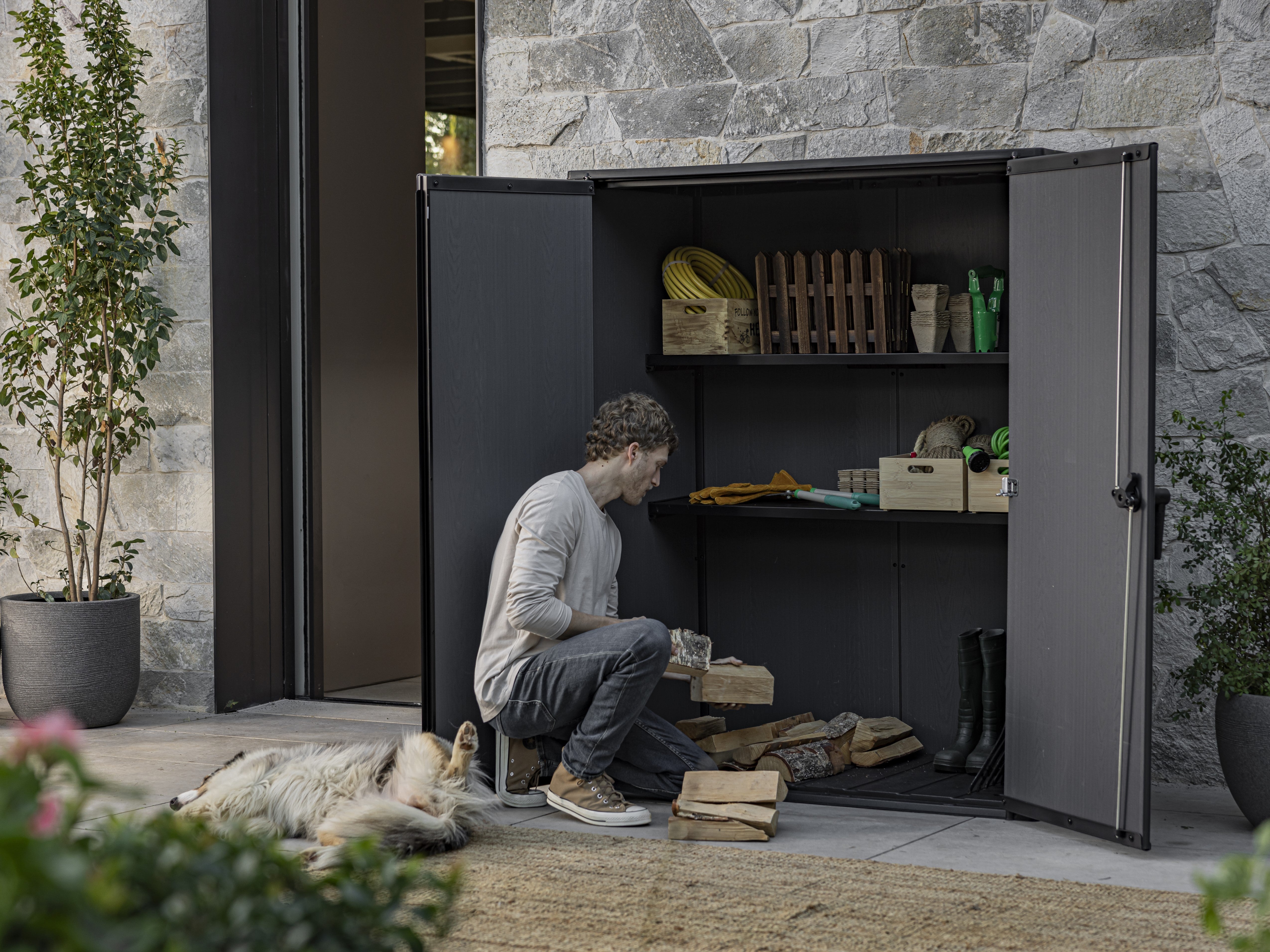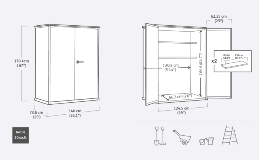 - 1400L tall outdoor storage shed, perfect for long handled gardening tools like rakes and hoes, along with cushions, toys or bags of potting mix