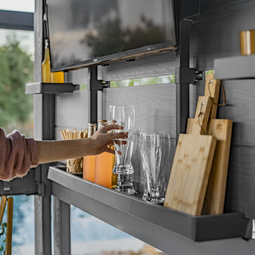 - Integrated side shelves, ideal for plates, utensils or ingredients.