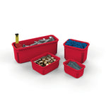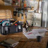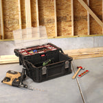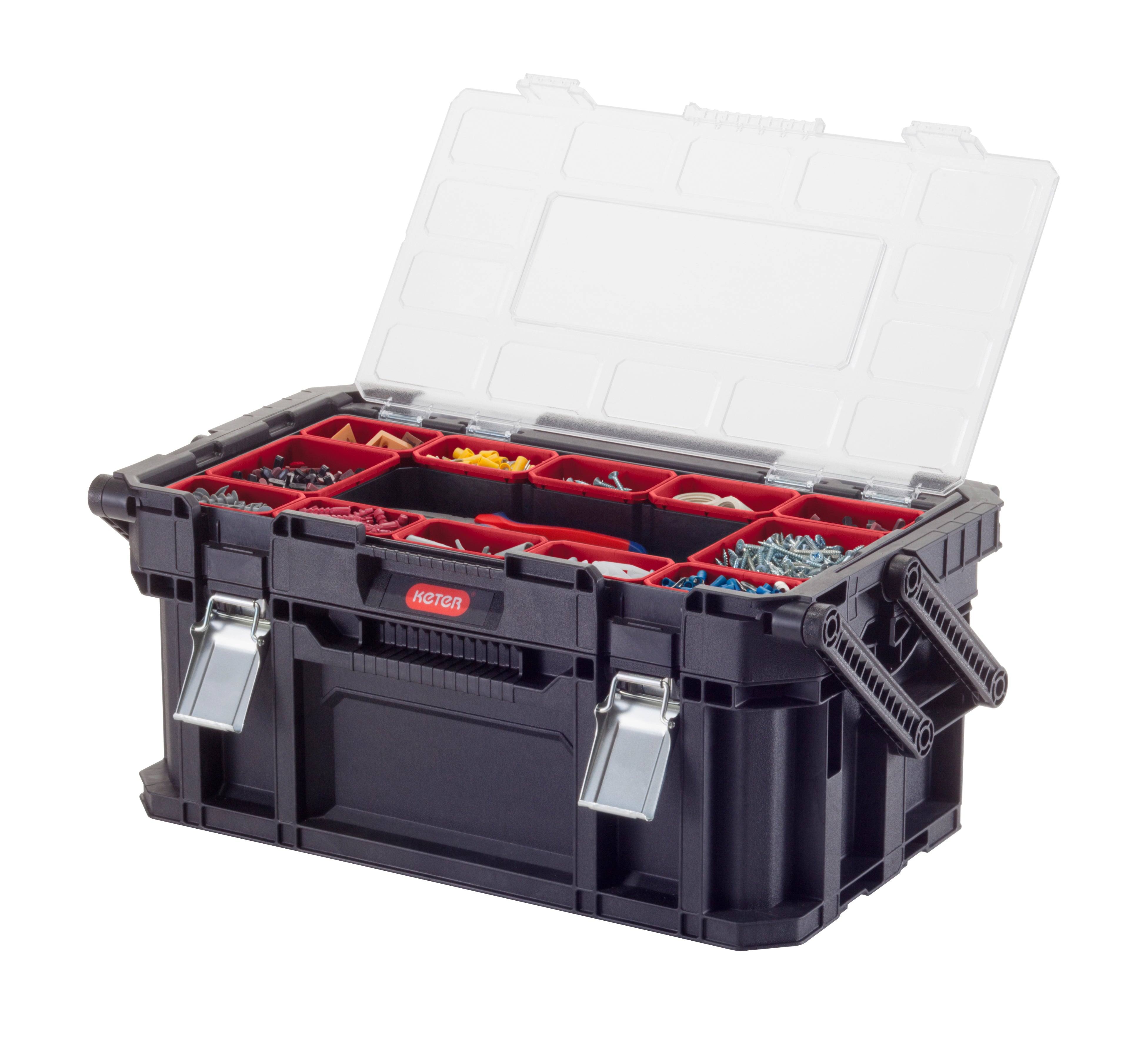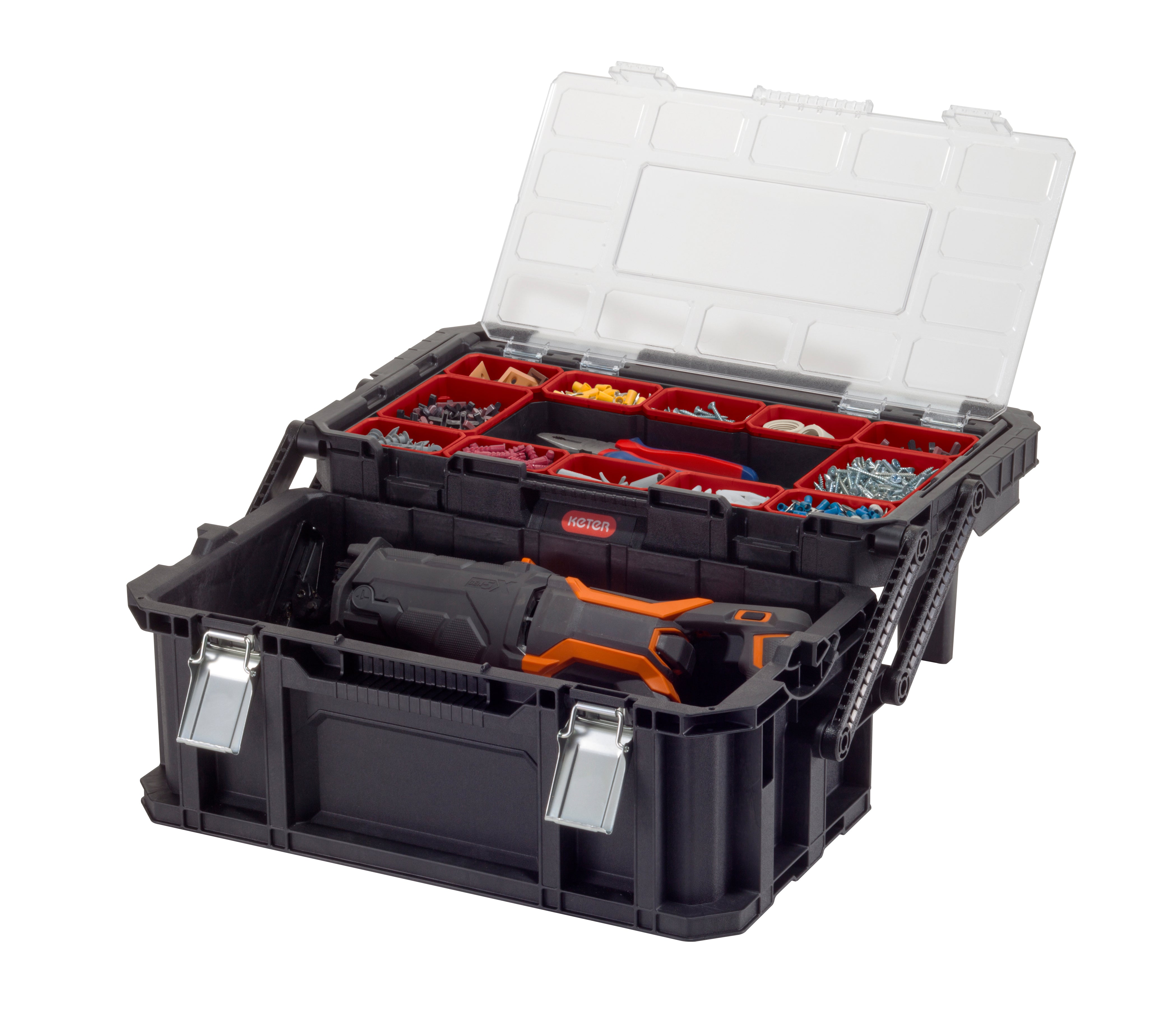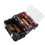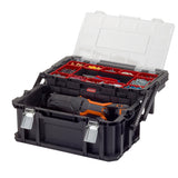 Experience the convenience of the Connect Cantilever Tool Box's heavy duty cantilever system, allowing you to easily view all contents in a single glance. Sturdy back support legs ensure maximum stability when the box is open and the clear smash-proof polycarbonate lid lets you keep an eye on your small parts. With multiple sized removable bins, you'll have plenty of storage options, and the extra-long handle helps with balanced carrying. This tool box is fully compatible with the Connect Rolling system, and durable metal latches keep your contents securely in place during transport.