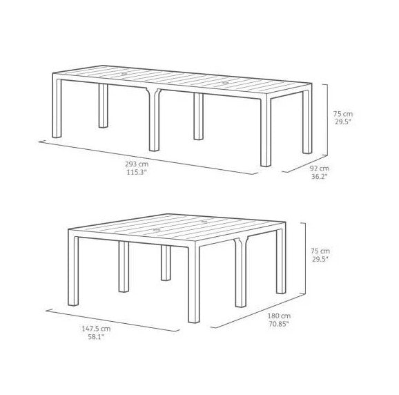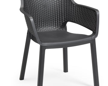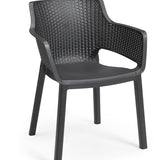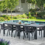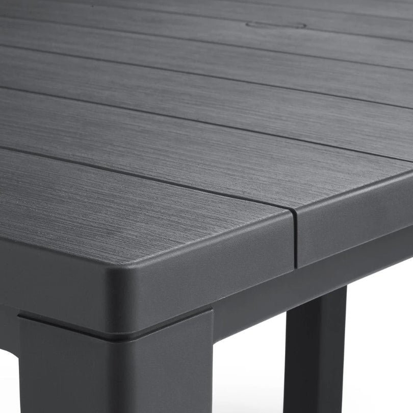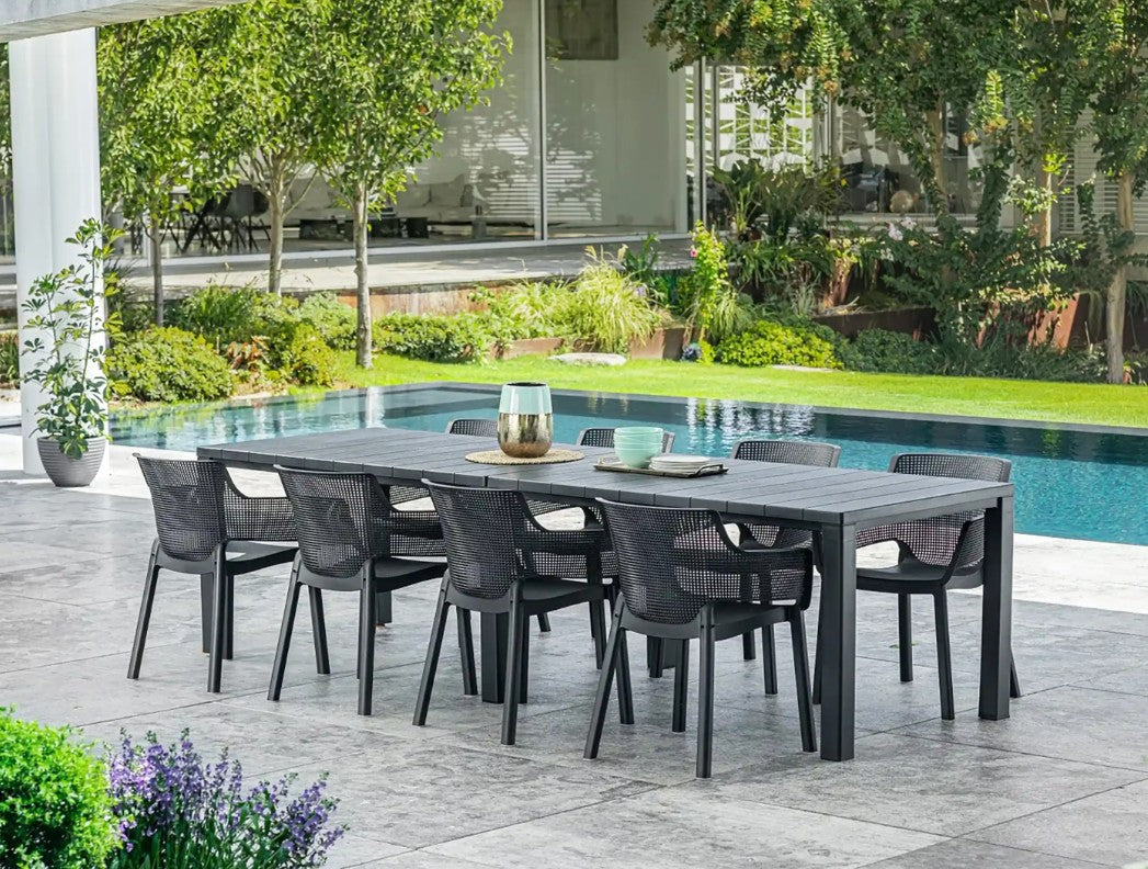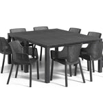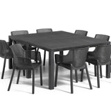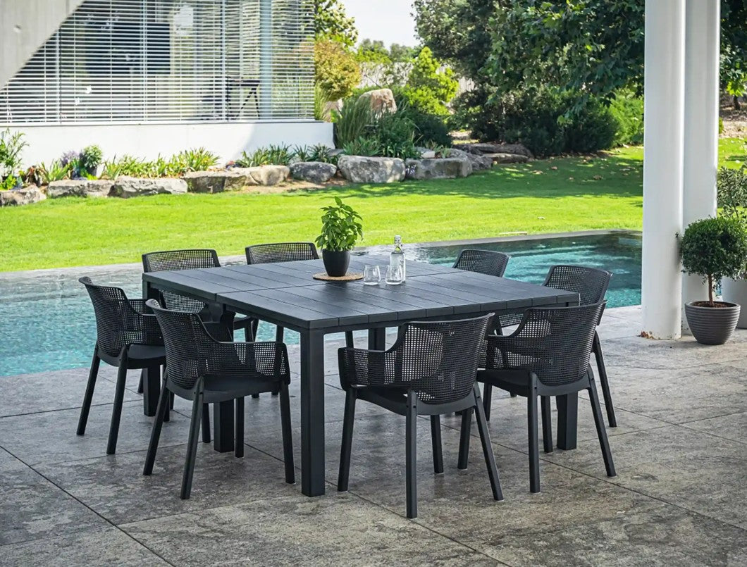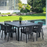 A dining table is essential for each garden. The remarkable sleek design and his gorgeous wood look surface, are the details for a unique appearance. This table comes with 8 Eva Chairs, The table and chairs are made of durable resin. Weather resistant, so it stays beautiful for years. Above all there is virtually no maintenance, just go over it with a damp cloth.