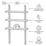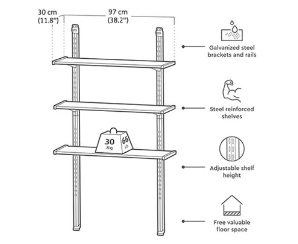 - Strong enough to holds 30kg per shelf (90 kg total).