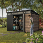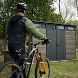 Step inside and you’ll find 13.7 cubic meters of spacious, secure storage that can easily accommodate gardening gear, tools, bicycles, and a workbench. The shed's heavy-duty floor is strong enough to support all your heavy equipment, even a full-sized riding lawn mower!