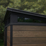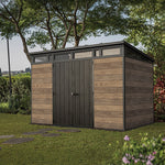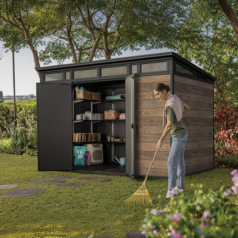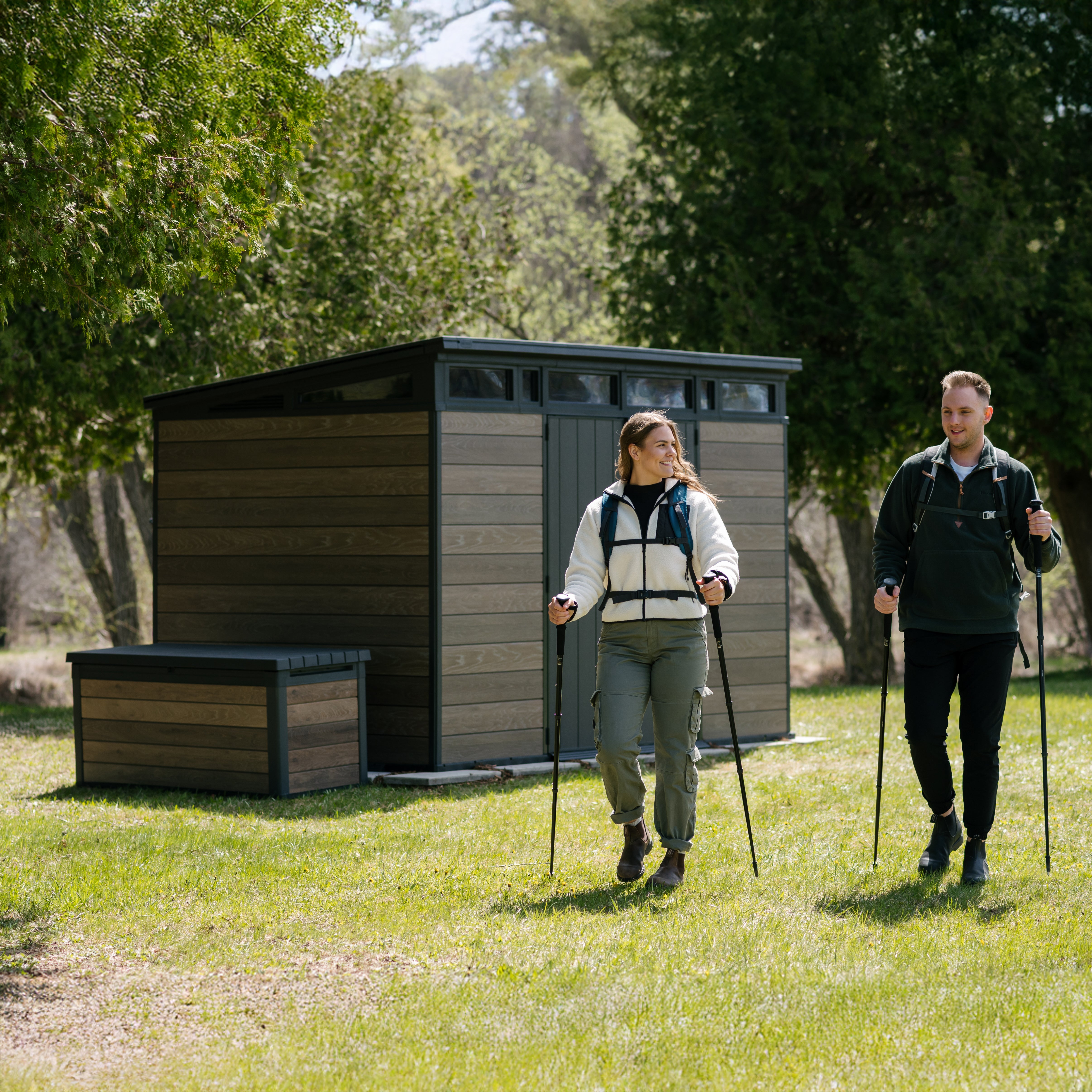 Beautify your backyard and protect your equipment with the Walnut 11x7 shed from Keter’s Signature Collection. The durable resin material resists peeling, rot, moisture buildup, and water damage, delivering a low-maintenance 11x7 plastic shed with the look of natural walnut wood and none of the problems.